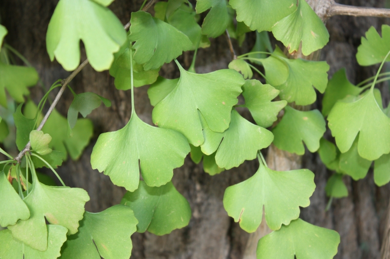 イチョウの葉 現生としては、1科1属1種が知られるのみで、世界中に移植され、どこにでも見られるが、原産地は中国安徽省南部と浙江省北部とされており、保全状況評価ではEN(絶滅危惧)とされている。丈夫で、長命。幹は直立し、樹高30mになる。樹皮は淡灰褐色で、縦に浅く割れ目ができる。よく分岐し、萌芽力も強い。老成すると、横にでる太い枝の下側に、乳垂(ちだれ)と呼ばれる「気根」が見られることがあるが、いわゆる「根」の構造はなく、その役割は不明である。材は黄白色で柔らかく緻密なので、碁盤、将棋盤、彫刻材などに使われる他、樹脂細胞が無いので「まな板」にするのに最もよい木とされ、水分をよくはじき、耐水性に優れる他、臭いが移りにくく、抗菌性が高く、耐久性がある。弾力性があるため、包丁の刃当たりが良く、刃に優しいことに加えて、軽いので扱いやすい。