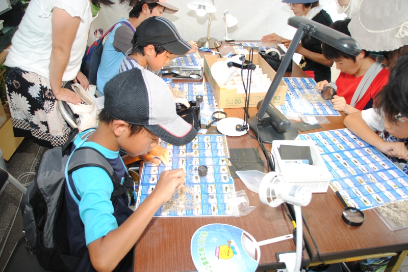 チリモンの同定を試みる子供達 今年の環境デーなごやでは、当センターからチリモンを実際に探し出して、そしてそれが何かを確認することが体験できるブースを出展させて頂きました。残暑の中、多数の方々にお立ち寄りいただき、真剣にチリモン同定に参加していただきました。この日のために準備したチリメンジャコは、和歌山の海産物業者「カネ上」さんから購入したチリメンが豊富に含まれている特別なもので、より簡単にチリモンを探し出すことができます。チリモンとはいっても食べても安全で、とてもおいしいチリメンジャコでした。
