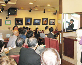 興味深いのは、千種区にある宮原氏の自宅から瑞穂区の名市大まで約5kmの道のりだそうですが、IPパケットはなんと(それも必ず!)東京を経由するそうです。にもかかわらず、所要時間は1秒以下! これでは世界が近いと感じる訳です。また、Webサーバが繋がっている地域やネットワークによって、いくつかの経路があることが紹介され話題提供は終わりました。続いて、参加者との質疑応答があり、「転送の速度」や「回線が太いとか細いと言われる意味」についても理解が深まりました。インターネットがより身近にイメージできるようになった2時間でした。