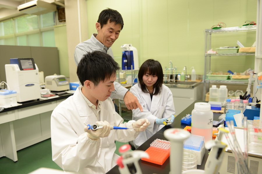 本研究科は、社会人や外国人留学生も含め、様々な素養と経歴をもつ学生を全国から受け入れています。多様なバックグラウンドとその融合に基づいたひらめきが、フロンティアを開拓する重要な原動力になっています。学年定員が、博士前期課程25名、後期課程5名であり、教員一人当たりの学生数が過大でなく、大学院生はきめ細かな研究指導を受けることができます。指導教員によるセミナーはもちろんのこと、講義においても学生一人ひとりに目が届くような配慮がされています。また、高価な実験機器を比較的自由に利用することができます。これは、研究を能率良く進める上でとても重要なポイントです。次世代DNAシーケンサー、キャピラリー式DNAシーケンサー、分子間相互作用解析装置、電子顕微鏡(透過型、走査型)、イメージアナライザー、顕微イメージングFT-IR分光器、X線回折装置など、先端的な共同利用機器があり、研究室の垣根を越えて思いのままに利用できる研究環境が魅力です。