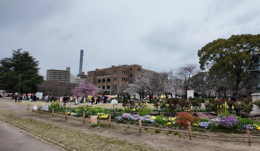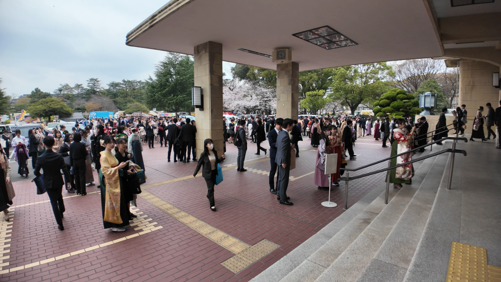 今日の天候は、あいにくの曇天でしたが、花盛りかつ綺麗な袴姿の卒業生が集い、とても華やかでした。